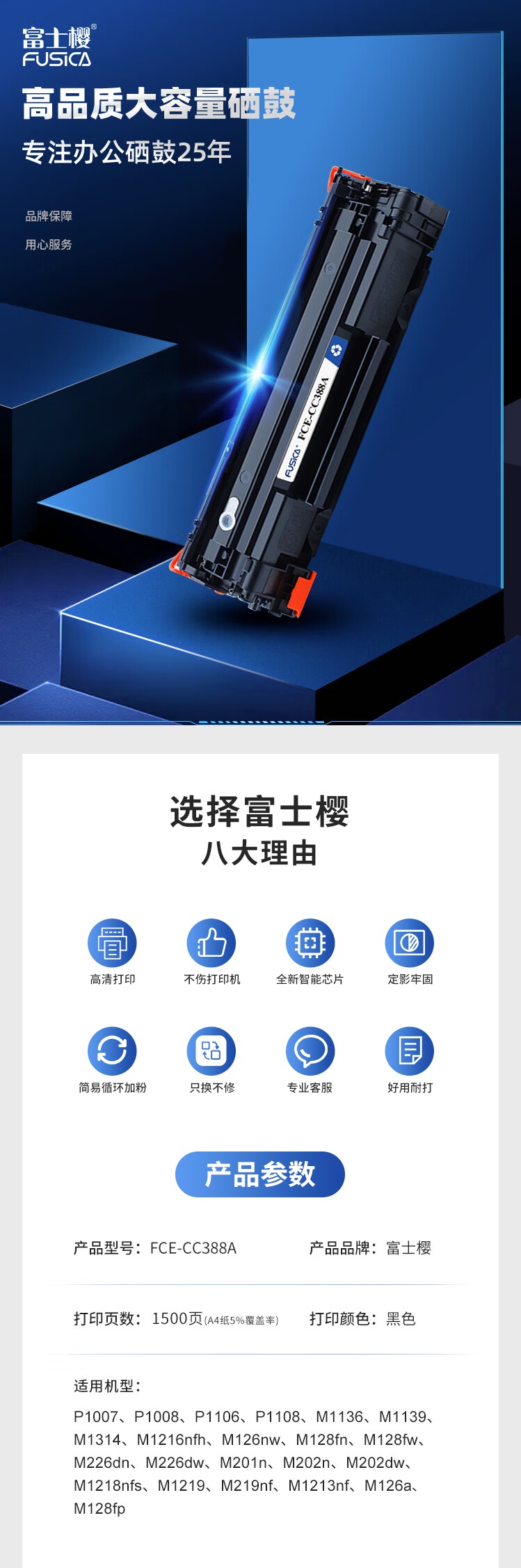 | 适用机型 | P1007;P1008;P1106;P1108;M126a;M126nw;M128fn;M128fp;M128fw;M202n;M202dw;M226dn;M226dw;M1136;M1139;M1213nf;M1216nfh;M1218nfs;M1219;M1219nf;cc388a;88a |